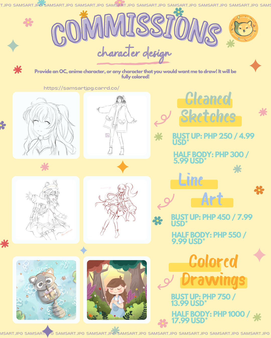 Thank you so much for being interested with commissioning from a litol artist! 💕 Rest assured, I will always do my best to make sure that you will be satisfied with the finished piece! 🥰 Before we get into details with the artwork, here are some terms and conditions that you need to read carefully. Also, don’t forget to follow my Instagram account @samdoess.art for more!I, Samsart.jpg :✔ retain all copyrights over the commissioned artwork.✔ reserve the right to post the commissioned artwork online, in my portfolio as well.✔ reserve the right to refuse, cancel and refund the order at any time for any reason.